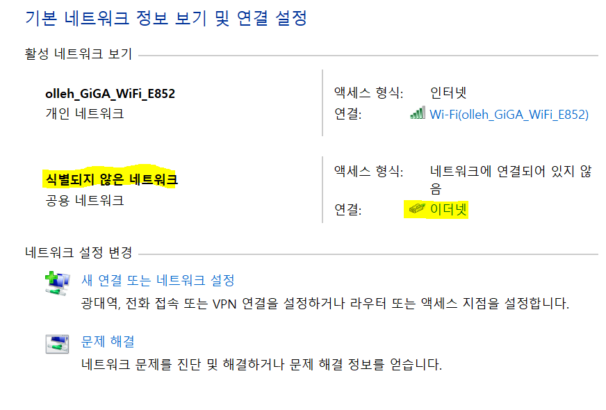 연결 후 네트워크 및 공유센터를 들어가면 기본 네트워크 정보 보기 및 연결 설정에 다음과 같이 나와있다.