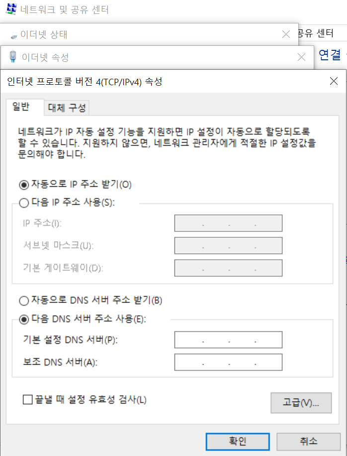 다음과 같이 자동으로 IP주소 받기라고 되어있을 것이다.